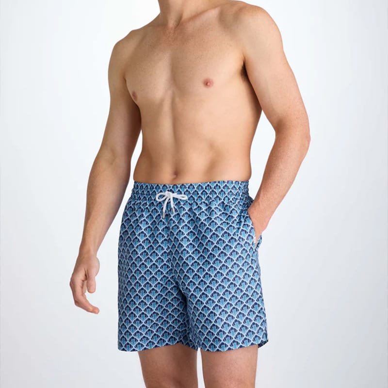 These blue geometric print men’s swim shorts combine modern style with everyday comfort. Crafted from quick-dry polyester fabric, they’re designed to move with you whether swimming, surfing, or relaxing by the pool.