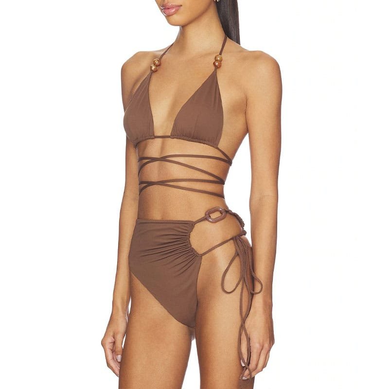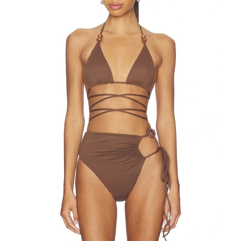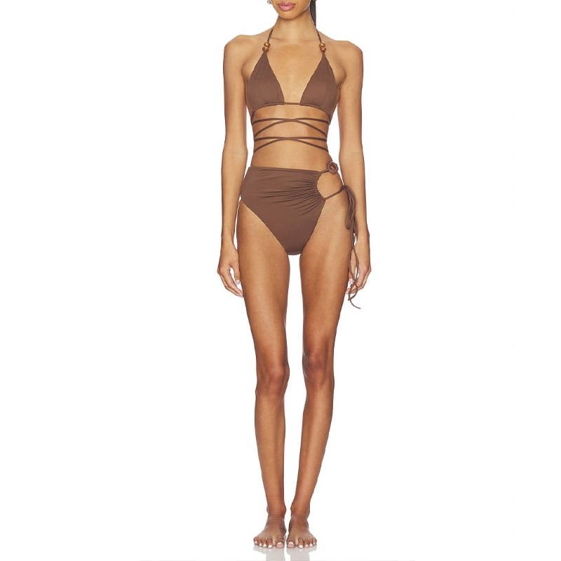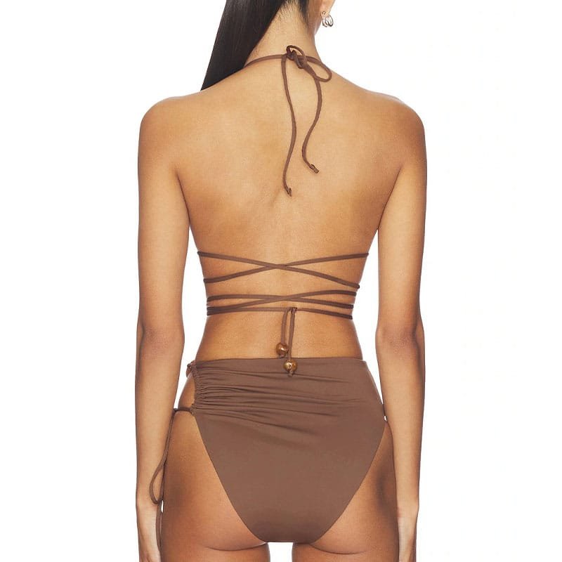 A statement triangle bikini set featuring a beaded halter top with long wrap-around strings for adjustable styling. Paired with a high-waist bottom finished with side ruching and ring-tie details for a flattering, sculpted fit. Ideal for premium resort, festival, and trend-led swim collections.