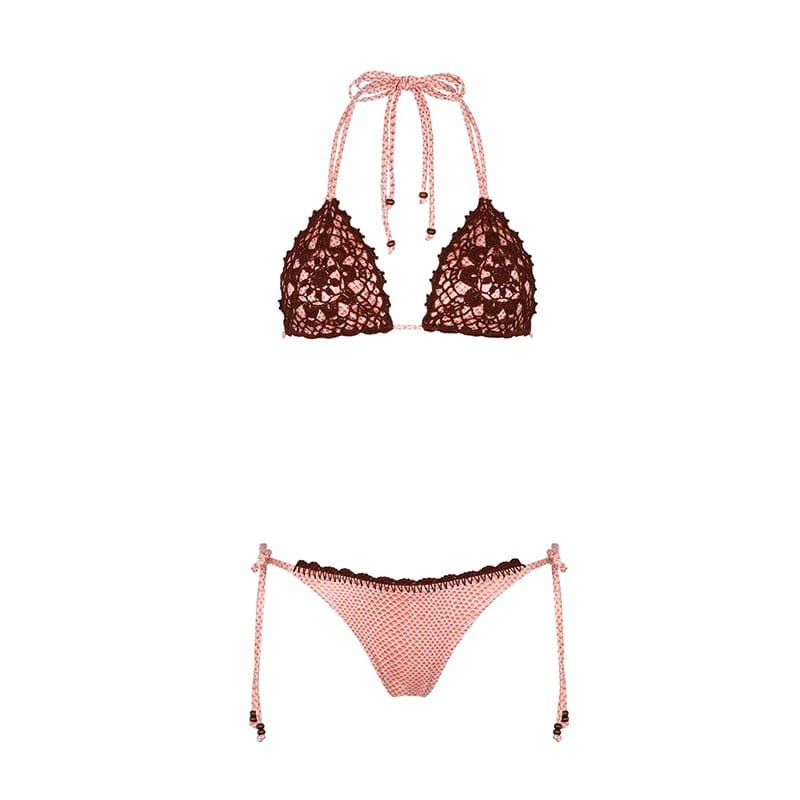 This beautifully crafted crochet bikini combines delicate crochet triangles on the top and matching bottom with adjustable ties. Its earthy tones, paired with a classic crochet design, make this bikini the perfect choice for boho-chic beachwear.