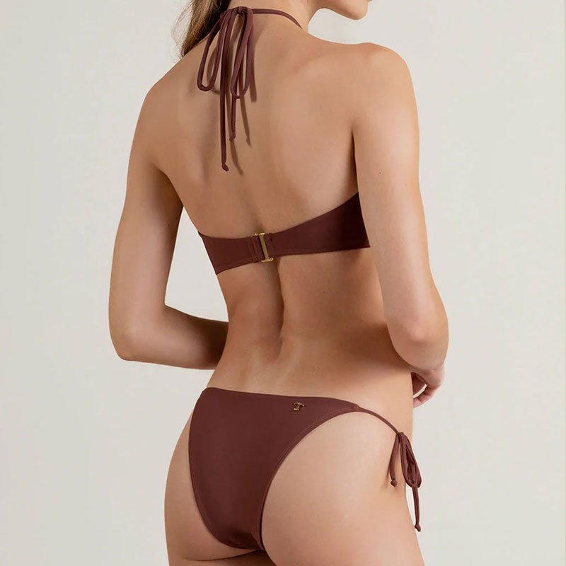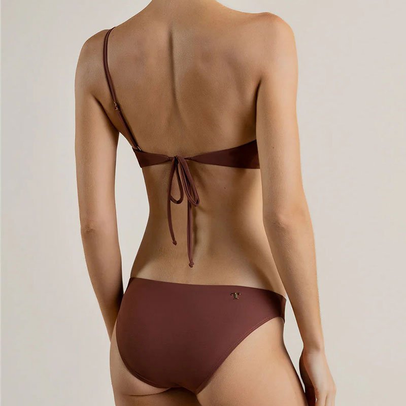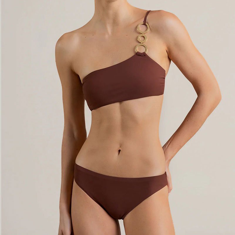 Warm, sleek, and resort-focused, this brown bikini set is defined by clean lines and gold-tone ring hardware that adds a polished statement finish. Shown here in both a halter bandeau version and an asymmetrical one-shoulder option, this style is especially well suited to mix-and-match swim collections