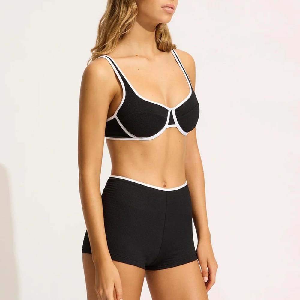 Sporty underwire bikini set with contrast binding and wide straps, paired with a high-waist boyshort bottom in textured nylon-spandex, ideal for swim, surf styling and resort retail.