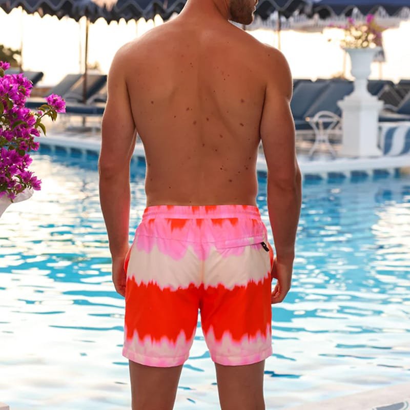 Trendy men’s swim shorts in a stylish pink to red gradient. Made from lightweight quick-dry polyester, perfect for beach and pool wear. Custom colours, sizes, and branding available.