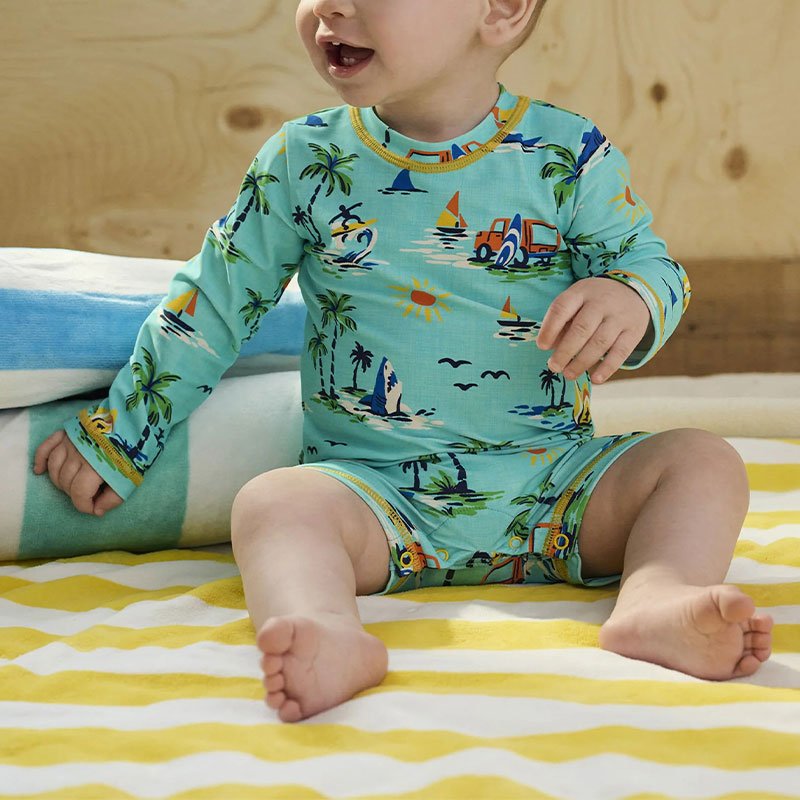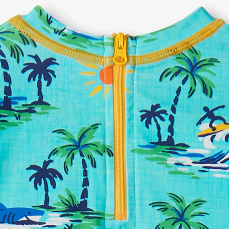This one-piece rash guard swimsuit features a playful tropical print, long sleeves, and a comfortable romper shape for easy movement and added coverage. The back zipper and bottom snaps make changes simpler, making it a practical choice for beach days, pool time, and sun-ready kids swimwear collections.