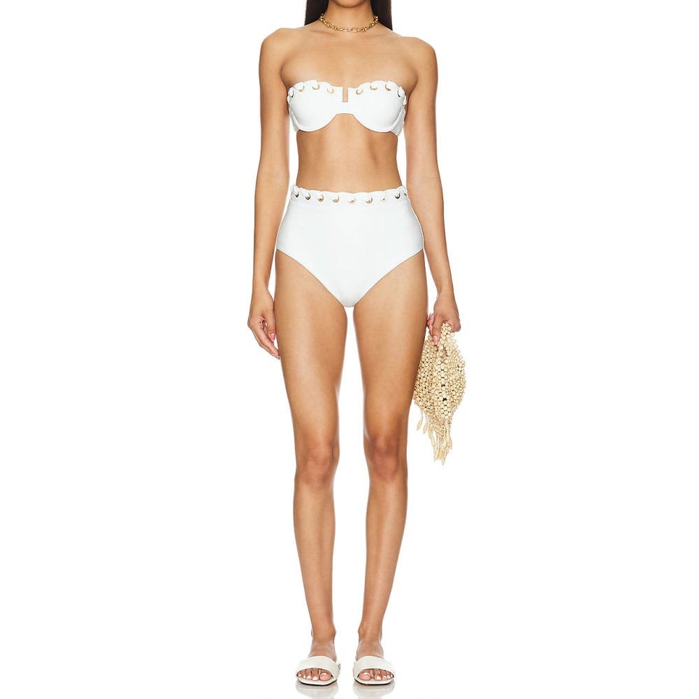 Custom strapless underwire bikini set featuring eyelet grommet lacing on edges. Stretch nylon-spandex, designed for beach clubs and boutique collections.