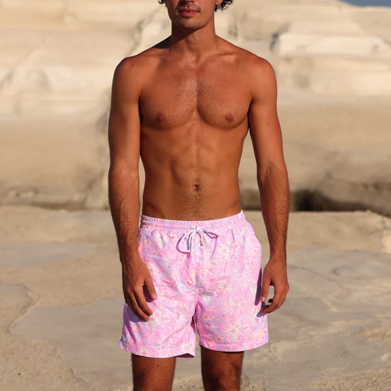 Stand out this season with these light pink tropical print men’s swim shorts, a fresh choice for summer collections. Crafted from lightweight, breathable fabric that dries fast, they’re ideal for seaside vacations, tropical getaways, and everyday swimwear.