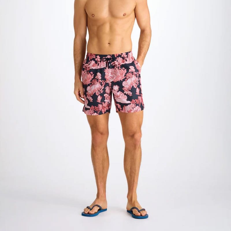 Add bold character to your collection with these black and red tropical print men’s swim shorts. The eye-catching floral design makes them perfect for summer getaways, poolside wear, and beach activities.