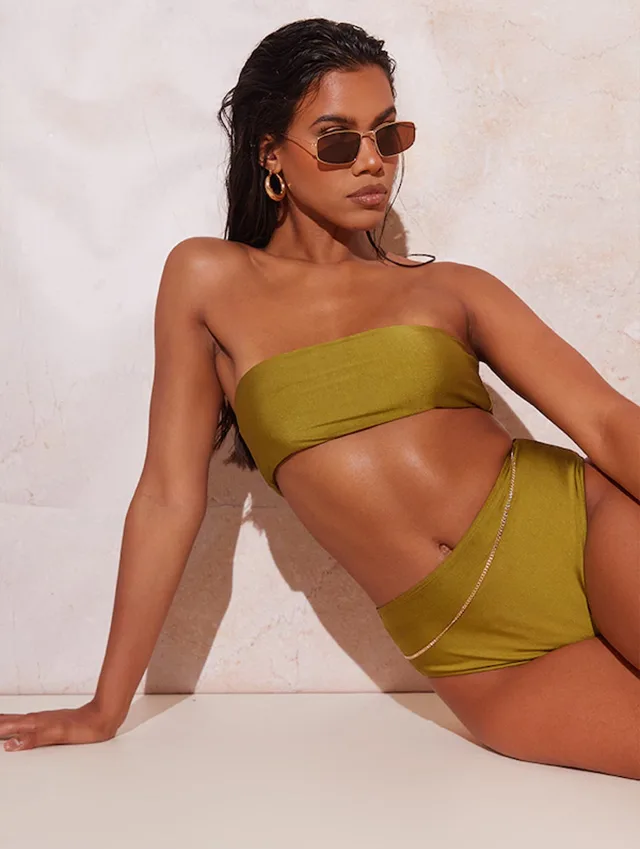 Why it works: The bandeau offers a clean, unbroken panel of shimmering fabric across the chest. This maximizes the visual impact of the material without the interruption of straps, creating a sleek, polished, and elegant look that’s perfect for sunbathing.